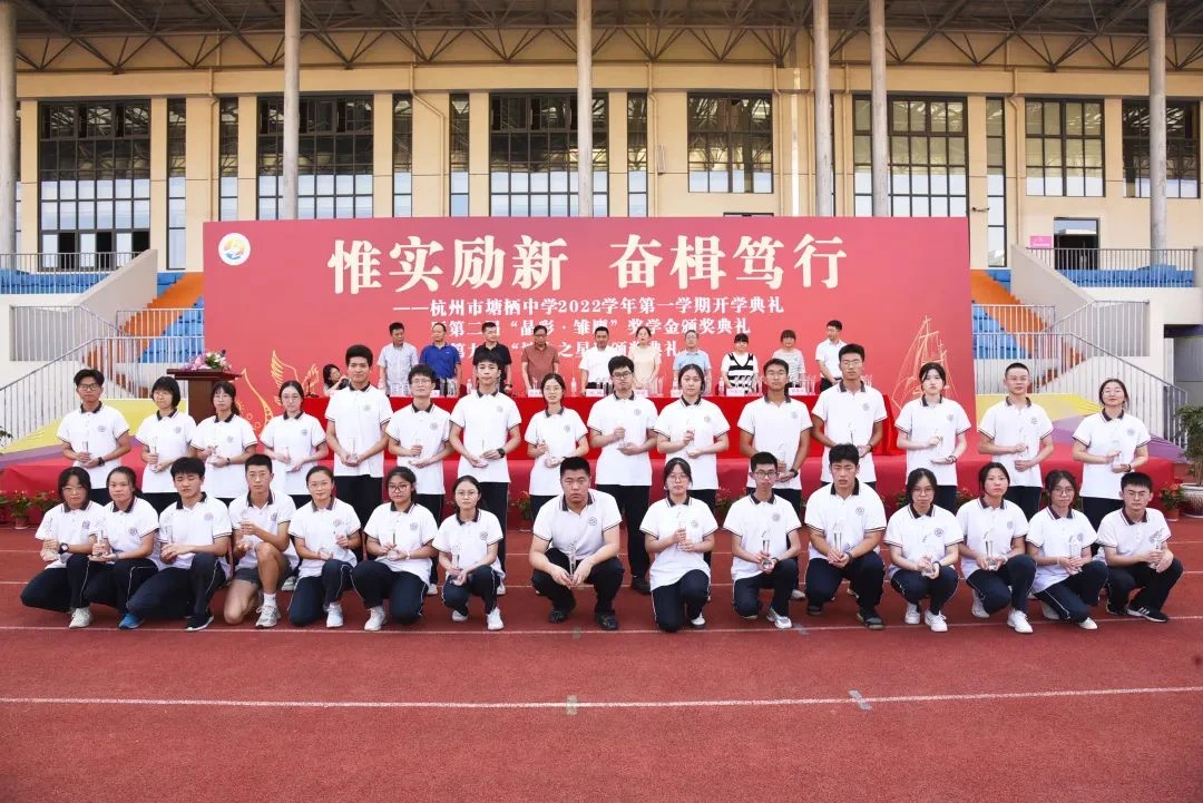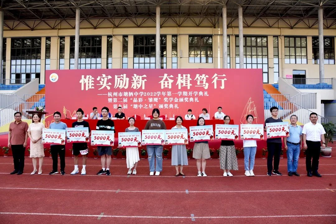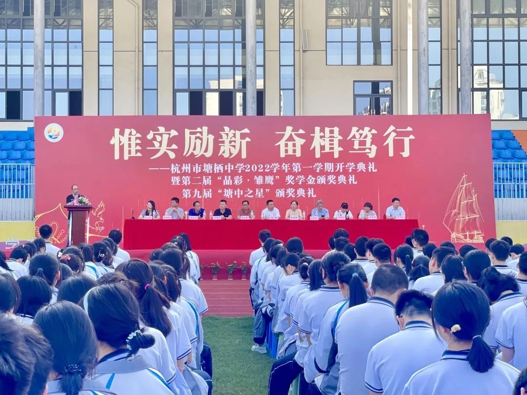 9月6日下午,豪门国际官网社区慈善基金会理事长孙伟荣、理事许素萍受邀参加了塘栖中学举办的2022学年第一学期开学典礼暨第二届“晶彩·雏鹰”奖学金颁奖典礼。